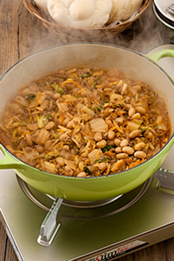 - 撒上辣椒粉,放上白菜菜干大火炒至菜干柔软通透后,再放上菜叶和大豆一起炒。